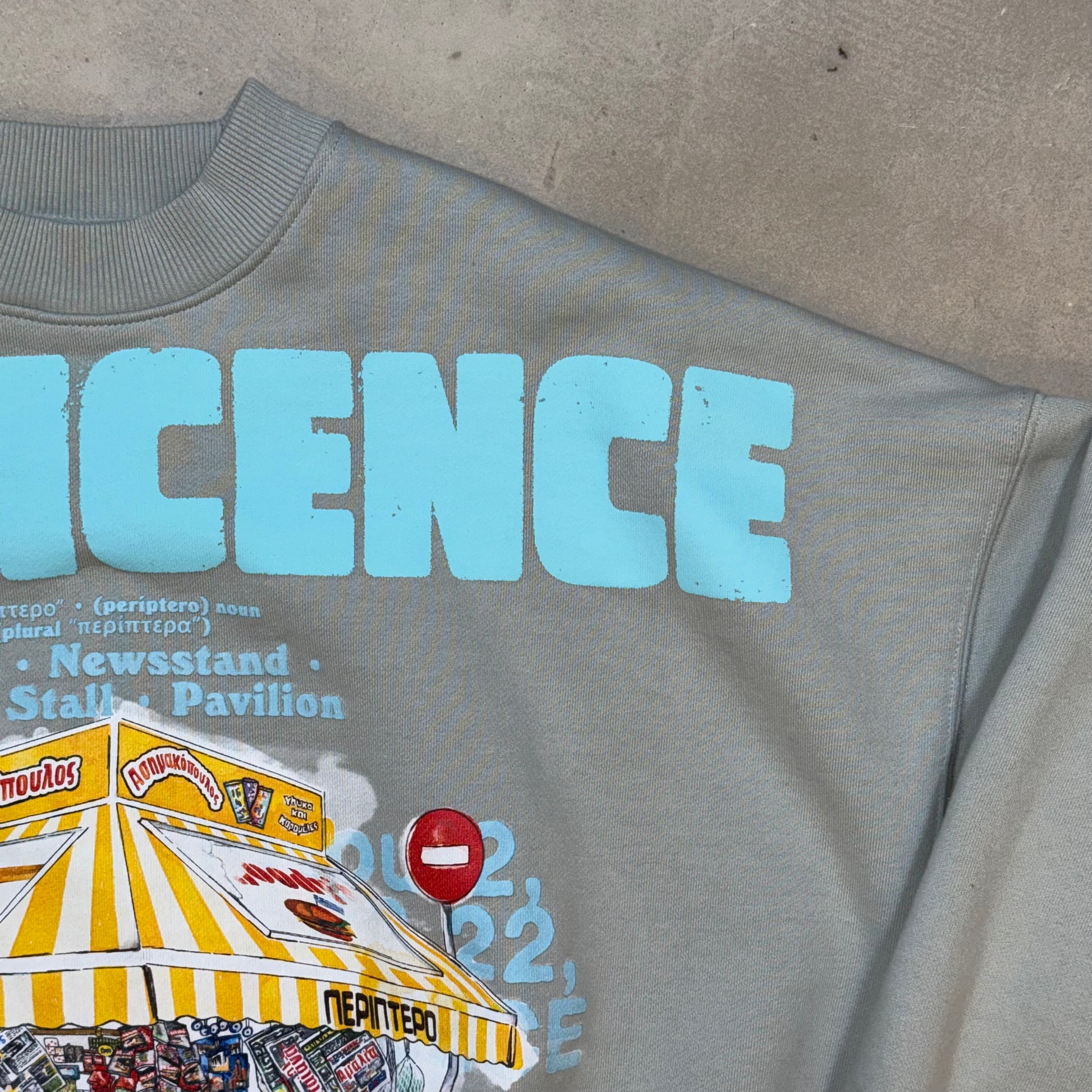 Lone Culprit Soho crewneck in a light blue colour with large graphic print on the front and small detail on the back. Made from very high quality materials. Fits very cropped on the body with very baggy arms.