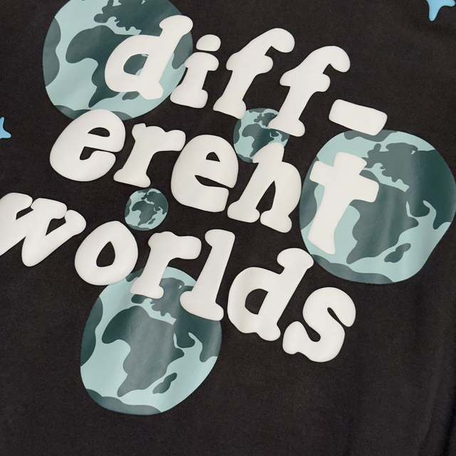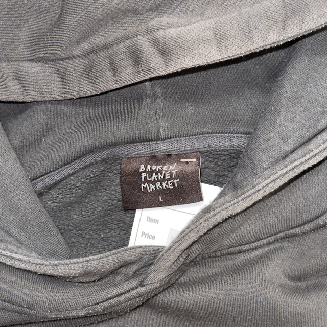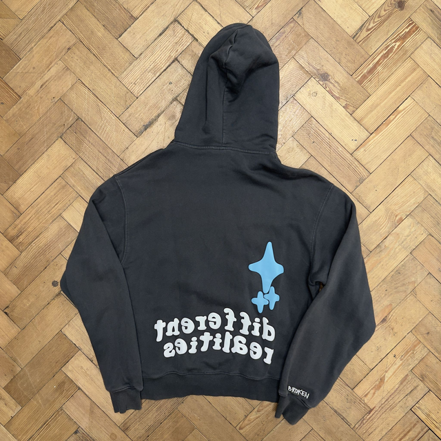 Broken Planet Different Worlds hoodie in dark grey with classic puff print graphic on the front and back.
