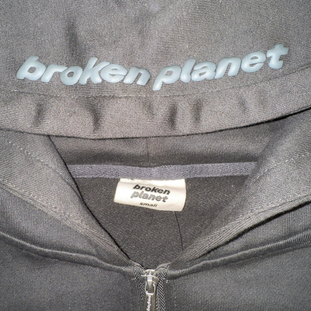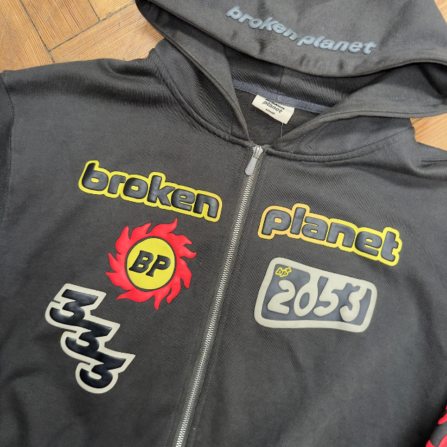 Broken Planet Performance zip hoodie in grey with multiple puff prints graphics all over. Made from high quality materials.