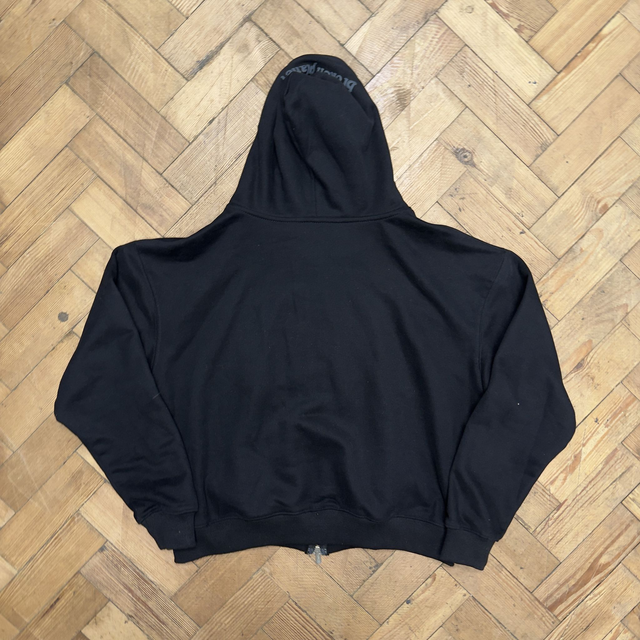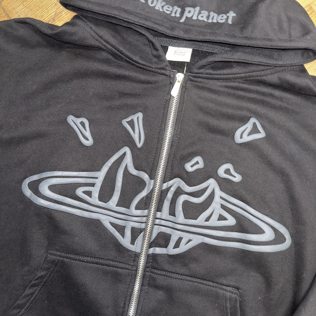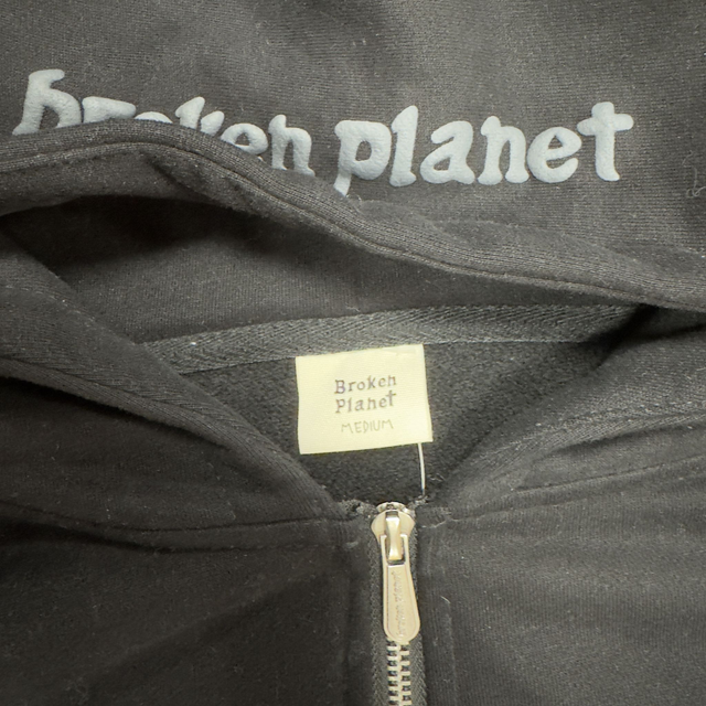 Broken Planet hoodie in black with full zip enclosure, featuring the brands classic puff print graphic on the front. Made from high quality materials.