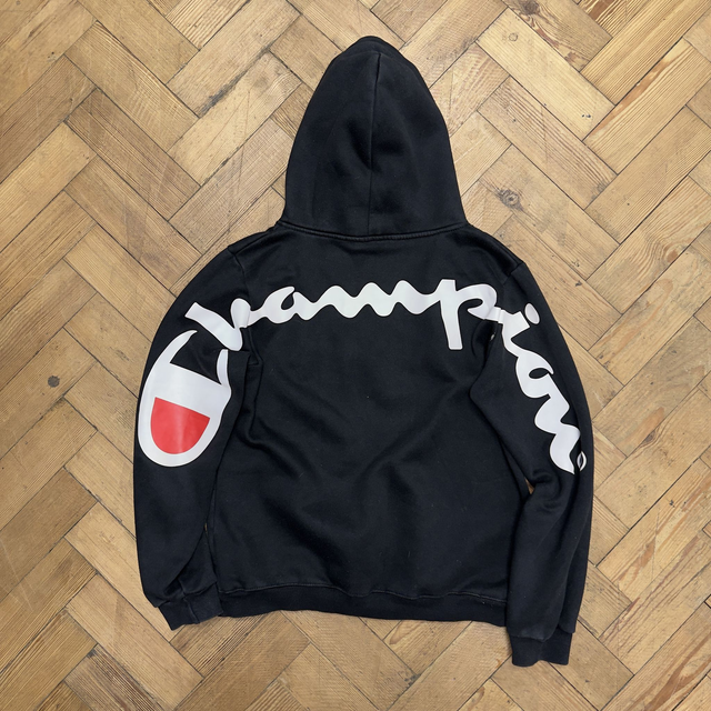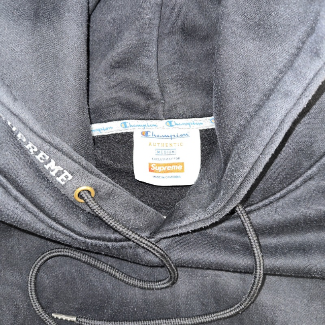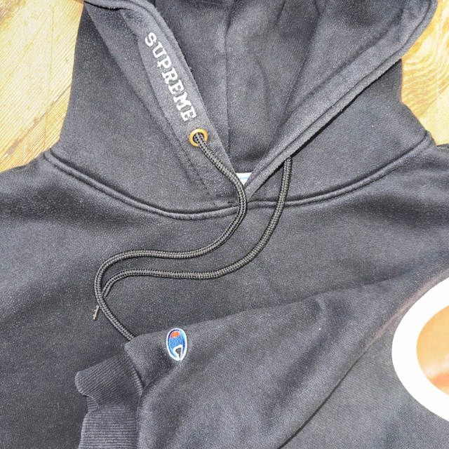 Champion X Supreme hoodie in black with small embroidered logo spellout on the hood and large graphic print on the back. Made from high quality materials.
