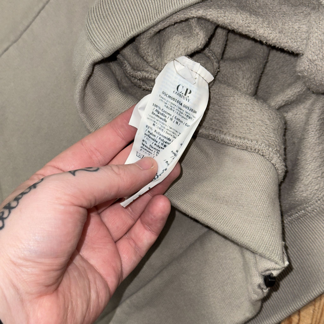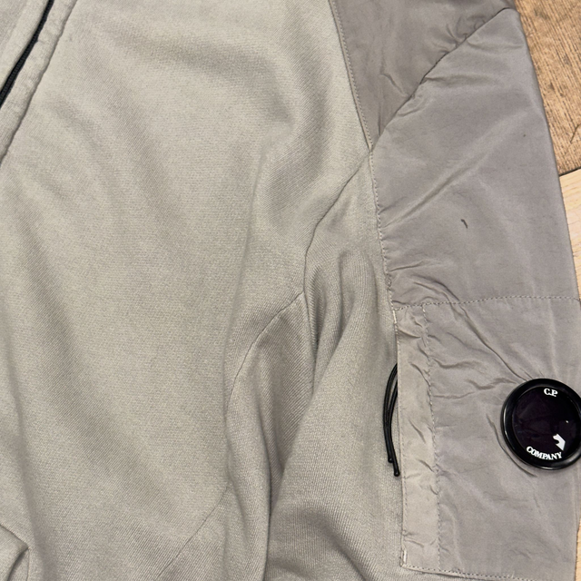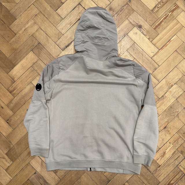 CP Company hoodie in biege with nylon panel detailing. Made from high quality materials and featuring iconic removable lens on the arm.