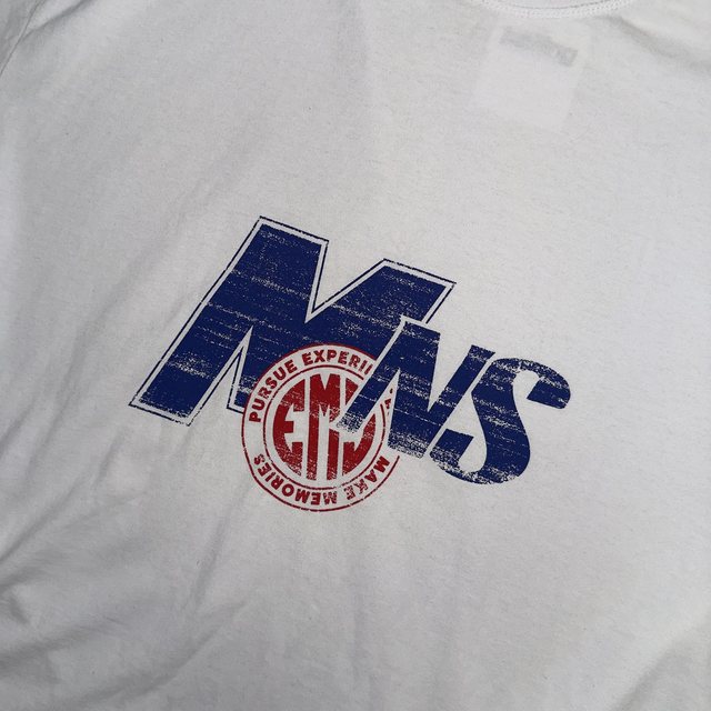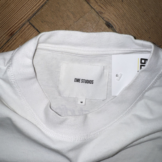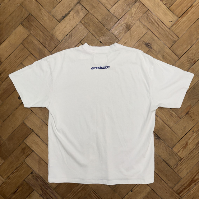 Ehmes Studios tee in white with graphic print on the front and logo spellout on the back.