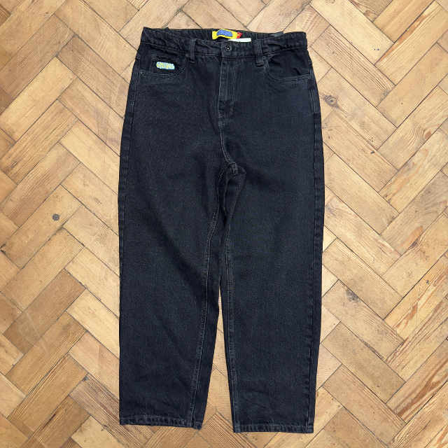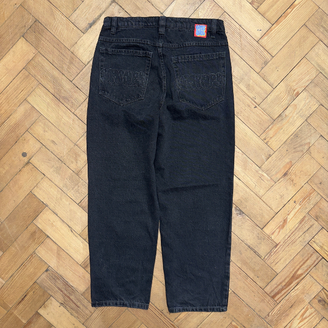 Empyre black jeans with some branding hits throughout and embossed design on the back.