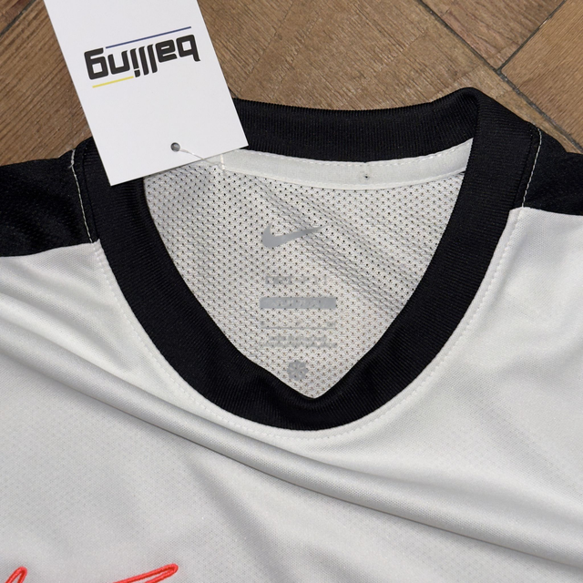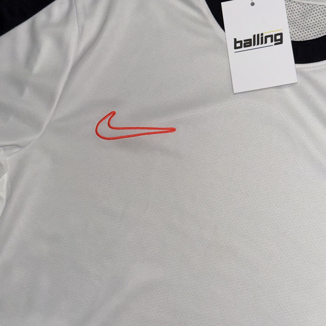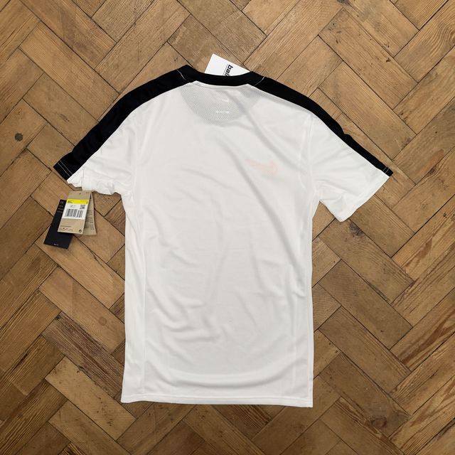 Nike Dri Fit tee in white and black with small embroidered swoosh on the front.
