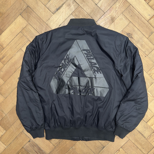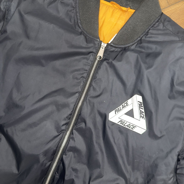 Palace bomber jacket in black with orange lining. With small printed logo on the front and large logo on the back. Made from high quality materials.