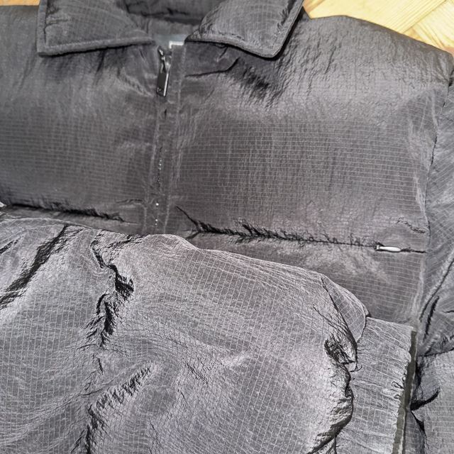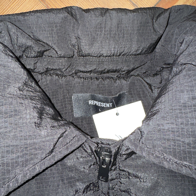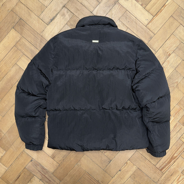 Represent puffer jacket in black with two zip pockets on the front.