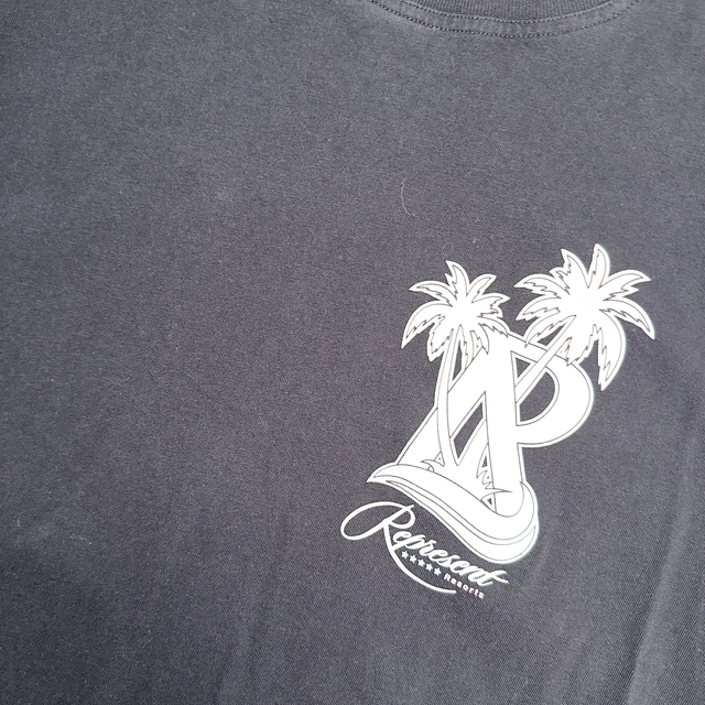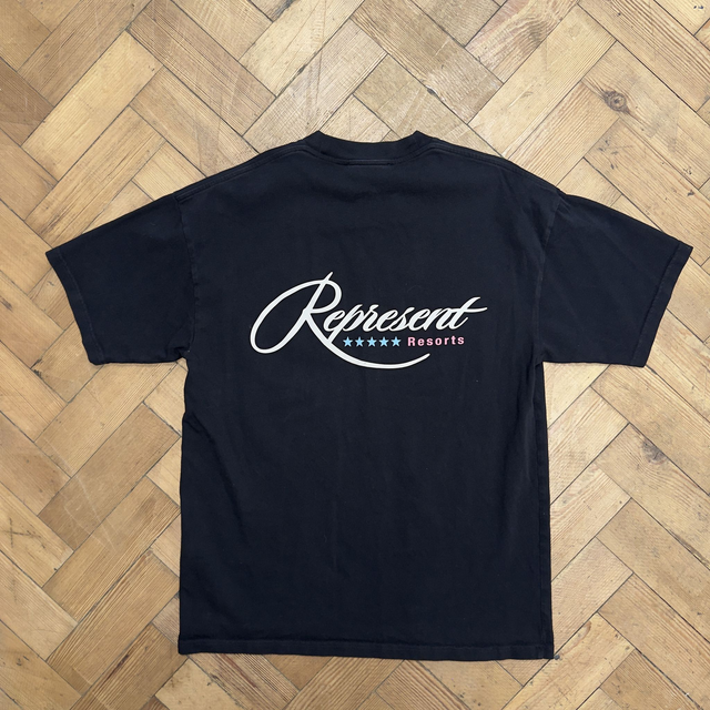 Represent Resorts tee in black with small graphic print on the front and print on the back.