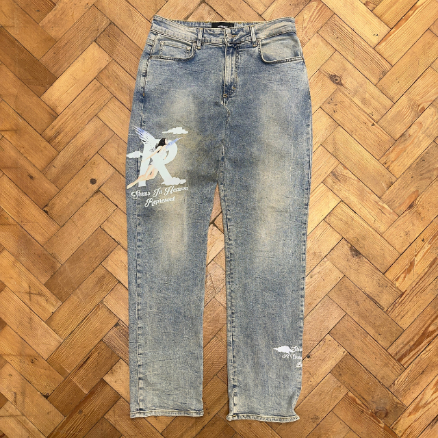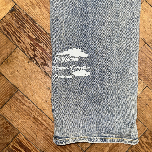 Represent Storms in Heaven jeans. Made from high quality materials featuring iconic graphic prints on the front and back.