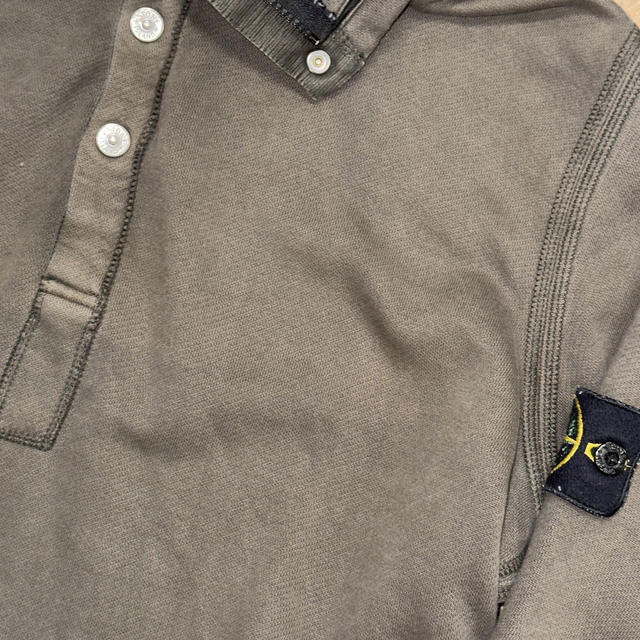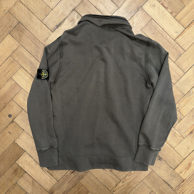 Stone Island jumper in green with 1/4 zip enclosure with buttons. Made from high quality materials and featuring removable badge on the sleeve.