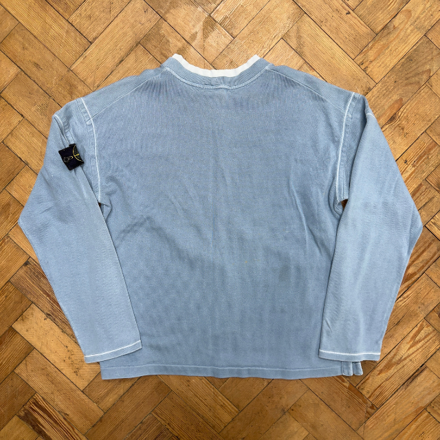 Stone Island vintage jumper in light blue. With iconic removable badge on the sleeve and layering details throughout.