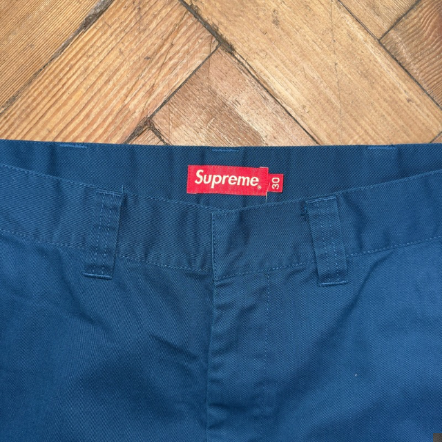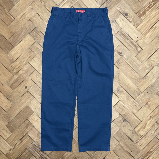 Supreme chino trousers in blue with minimal branding tab on the back pocket. Made from high quality materials.