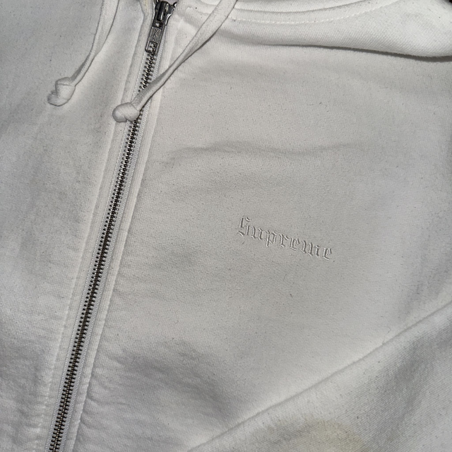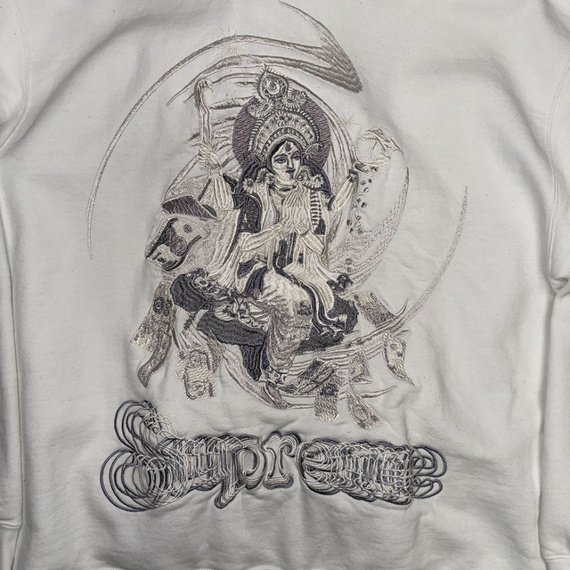 Supreme Lakshmi hoodie in white with full zip enclosure. Made from high quality materials. Featuring large intricate embroidery on the back.