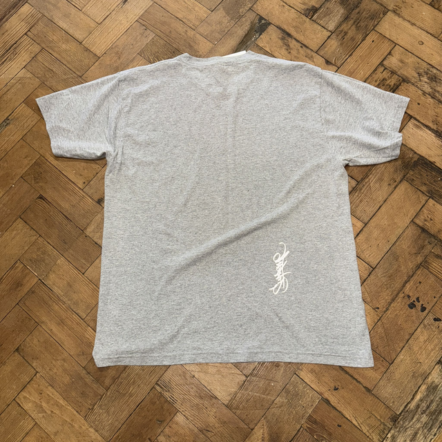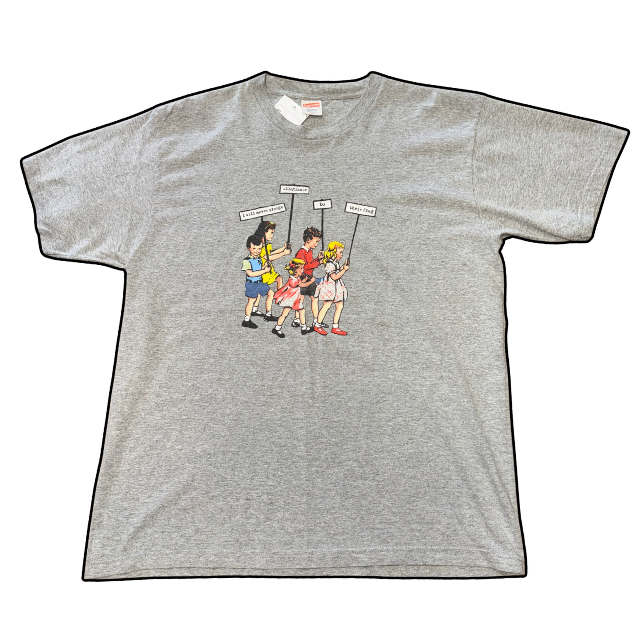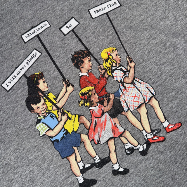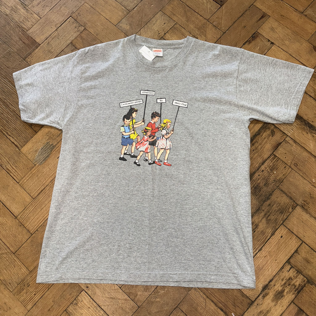 Grey Supreme Pledge Allegiance t-shirt in a size extra large. Supreme Pledge Allegiance graphic print on the front, Supreme spell out print in white on the back bottom right of the t-shirt.