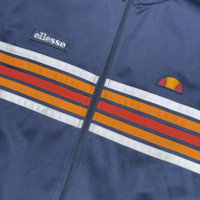 Vintage Ellesse track jacket in navy with striped embroidered details all over.