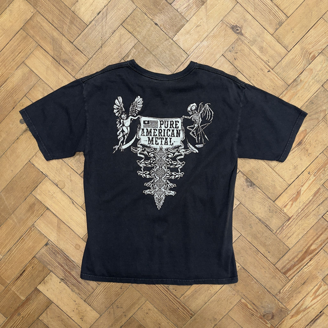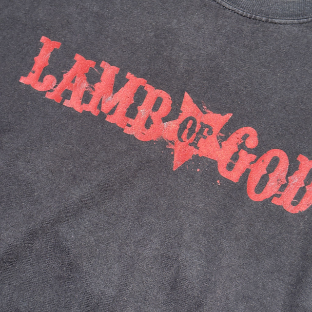 Vintage Lamb of God tee in black with small graphic print on the front and large print on the back.
