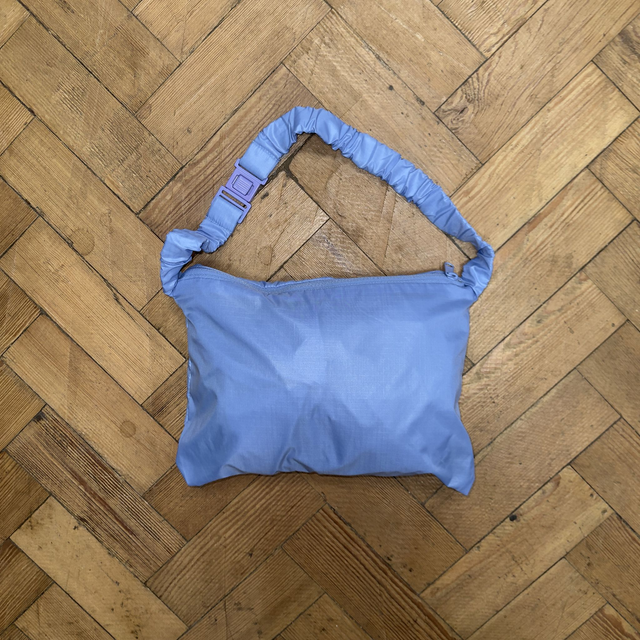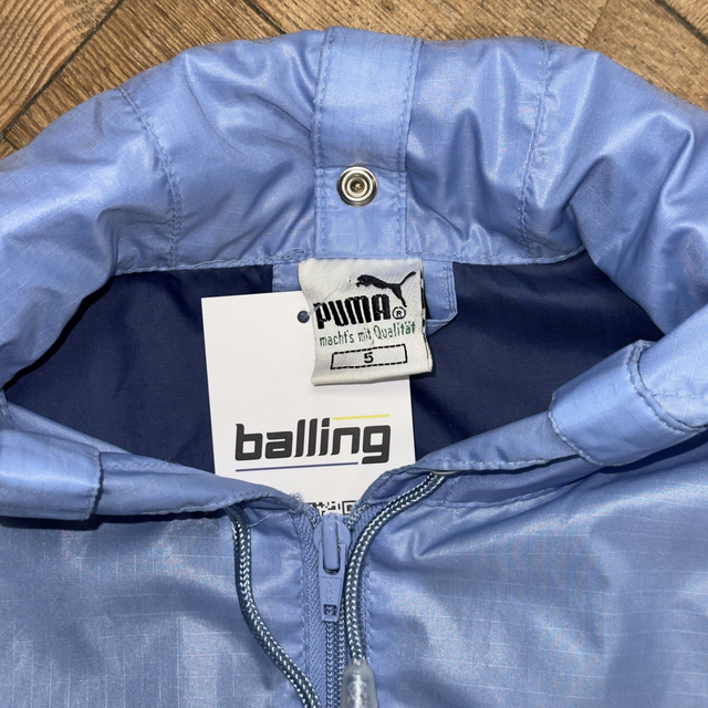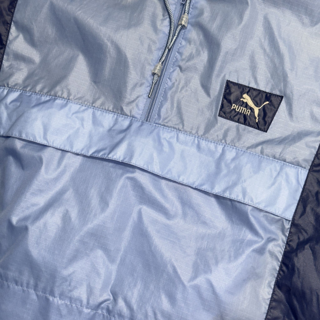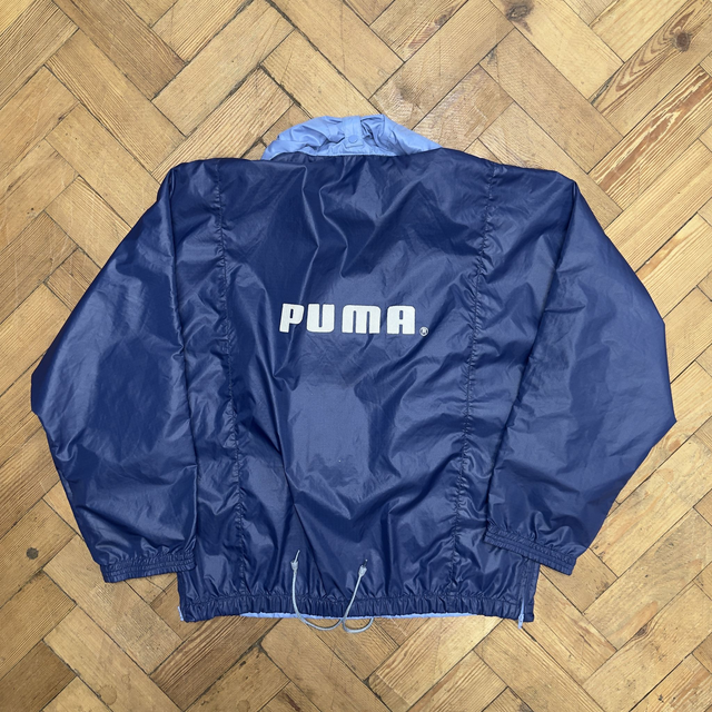 Vintage Puma jacket in two tone blue with felt details throughout. Packs into a compact sling bag.
